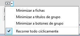 - Para cambiar la visualización de la cinta de opciones, haga clic en la flecha situada a la derecha de la barra de fichas y seleccione una opción. Se pueden minimizar a fichas o paneles. Puede alternar entre las opciones de la cinta haciendo clic en el icono en lugar de la flecha.