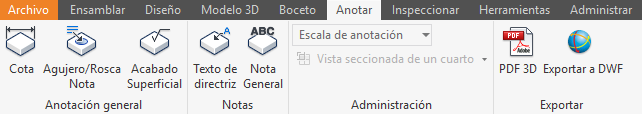 Utilice los comandos disponibles en la ficha Anotar de un archivo de pieza o de ensamblaje para añadir anotaciones 3D al modelo.