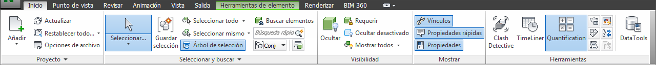La cinta de opciones está dividida en dos fichas, cada una de las cuales permite realizar una actividad específica. En cada ficha, las herramientas están agrupadas en una serie de paneles basados en tareas. Algunas de las fichas son contextuales. Al ejecutar algunos comandos, aparece una ficha contextual de la cinta de opciones especial en vez de una barra de herramientas o un cuadro de diálogo. Por ejemplo, cuando empiece a seleccionar elementos en la Vista de escena, aparecerá la ficha Herramientas de elemento, que hasta el momento estaba oculta. Si no se selecciona nada, la ficha vuelve a quedar oculta.