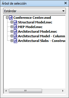 El Árbol de selección es una ventana anclable que muestra varias vistas jerárquicas de la estructura del modelo, según se ha definido en la aplicación de CAD en la que se creó el modelo.
