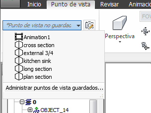 Haga clic en la ficha Punto de vista panel Guardar, cargar y reproducir menú desplegable Punto de vista actual y elija el punto de vista guardado de la lista.