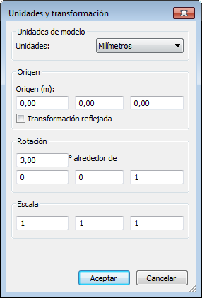 - Para modificar la escala del modelo, en el cuadro de diálogo Unidades y transformación, en el área Escala, especifique los valores para Los ejes X, Y y Z. Para escalar proporcionalmente, asegúrese de que los valores X, Y y Z sean iguales.