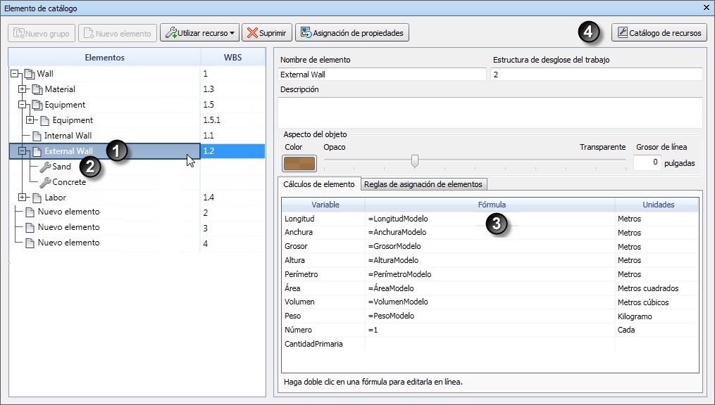 El catálogo de elementos es la base de datos organizativa de las mediciones. El Catálogo de elementos y el Catálogo de recursos comparten la misma estructura, un árbol de selección, un grupo de variables e información general. Los elementos del Catálogo de elementos pueden estar directamente asociados con un objeto de modelo como, por ejemplo, un muro o una ventana. Los elementos pueden existir solos o contener recursos.