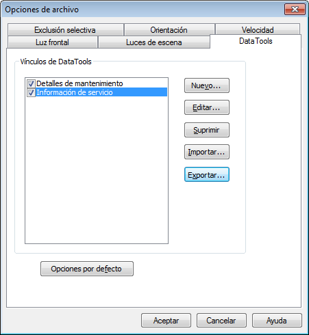 En el cuadro de diálogo Opciones de archivo, en la ficha DataTools, haga clic en el vínculo que desea exportar en el área de Vínculos de DataTools y pulse el botón Exportar.