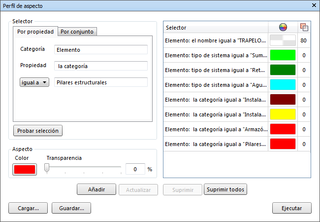 El Perfil de aspecto permite definir perfiles de aspecto personalizados basados en valores de conjuntos (búsqueda y selección) y propiedades, y usarlos para codificar objetos por colores en el modelo, con objeto de diferenciar tipos de sistemas e identificar visualmente su estado. Los perfiles de aspecto se pueden guardar como archivos DAT y compartir con otros usuarios de Autodesk Navisworks.