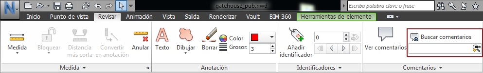 - En el cuadro de texto Búsqueda rápida de comentarios, escriba la cadena de texto que desea buscar en las propiedades de todos los comentarios. Puede tratarse de una o varias palabras. Por ejemplo, si escribe anotación y ejecuta la búsqueda, solo aparecerán los comentarios que contengan la palabra "anotación".