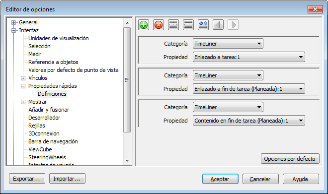- Añade varias definiciones más con la opción TimeLiner seleccionada en el cuadro Categoría, y la opción deseada en el cuadro Propiedad.