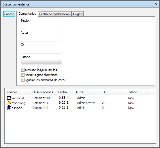 Hay tres fichas en la parte superior que permiten configurar los criterios de búsqueda. Al hacer clic en el botón Buscar se inicia la búsqueda. Los resultados que se encuentran aparecen en una la tabla con varias columnas en la parte inferior de la ventana. Puede usar las barras de desplazamiento en las partes inferior y derecha de la ficha para desplazarse de un comentario a otro. Hay distintos iconos que le ayudan a identificar el origen de cada comentario de un vistazo. Estos iconos son los mismos que los de la ventana Comentarios.