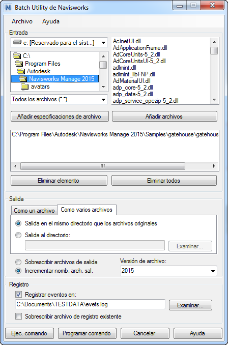 Batch Utility También puede hacer clic en el botón Añadir especificaciones de archivo. Autodesk Navisworks convertirá los archivos que se encuentren en la carpeta seleccionada. La opción seleccionada en el menú Tipo de archivo determina los archivos que se convertirán.