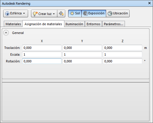 La asignación de material define cómo una coordenada 3D y una normal se transforman en una coordenada de textura 2D (UV), que a su vez se utiliza para buscar colores, etc. a partir de un mapa de textura. Cada asignación específica es otra "receta" diferente de cómo realizar la asignación. Los campos Traslación, Escala y Rotación y la secciónGeneral definen una transformación aplicada a cada coordenada 3D y normal antes de aplicar la receta para cada tipo de asignación específica que transforma el punto 3D en una coordenada de textura. Los valores de los campos Dominio mín. y Dominio máx. se utilizan en muchas de las recetas de asignación para determinar qué rango (mín. a máx.) de las coordenadas de espacio (X, Y, Z) se asigna de 0 a 1 en el espacio de textura para cada coordenada.