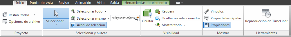 La cinta de opciones está dividida en dos fichas, cada una de las cuales permite realizar una actividad específica. En cada ficha, las herramientas están agrupadas en una serie de paneles basados en tareas. Algunas de las fichas son contextuales. Al ejecutar algunos comandos, aparece una ficha contextual de la cinta de opciones especial en vez de una barra de herramientas o un cuadro de diálogo. Por ejemplo, cuando empiece a seleccionar elementos en la Vista de escena, aparecerá la ficha Herramientas de elemento, que hasta el momento estaba oculta. Si no se selecciona nada, la ficha vuelve a quedar oculta.