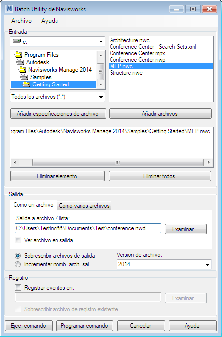 Batch Utility También puede hacer clic en el botón Añadir especificaciones de archivo. Autodesk Navisworks convertirá los archivos que se encuentren en la carpeta seleccionada. La opción seleccionada en el menú Tipo de archivo determina los archivos que se convertirán.