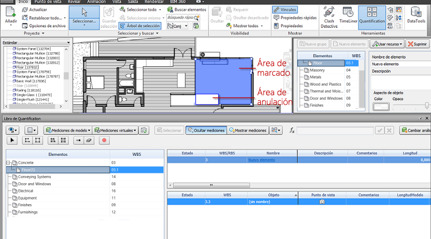 Recorte partes de la geometría utilizando la función Área de anulación. Al dibujar un área de anulación, puede excluir una parte de una medición de área. Las áreas de anulación resultan útiles cuando, por ejemplo, se ha marcado un área en el piso para su medición, pero se desea excluir una sección de esa área, como un pasillo, de la medición. A continuación, el área del pasillo anulada se "resta" del área de la plana en el libro de Quantification.