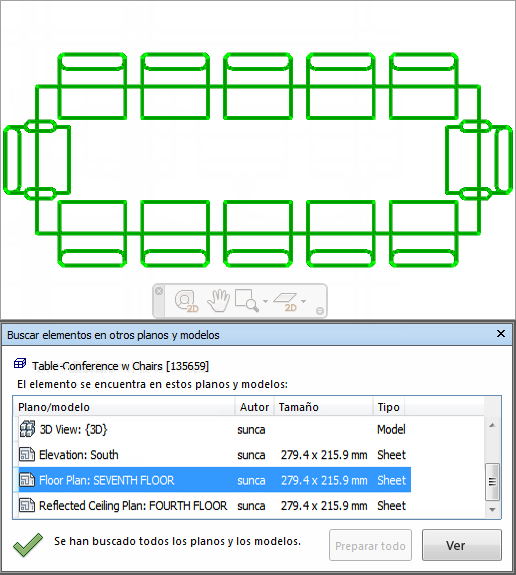 en la ventana Buscar elementos en otros planos y modelos, haga clic en el botón Preparar todo. Cuando todos los planos y modelos estén preparados, aparecerá una lista con todos los planos y modelos que contienen el objeto.