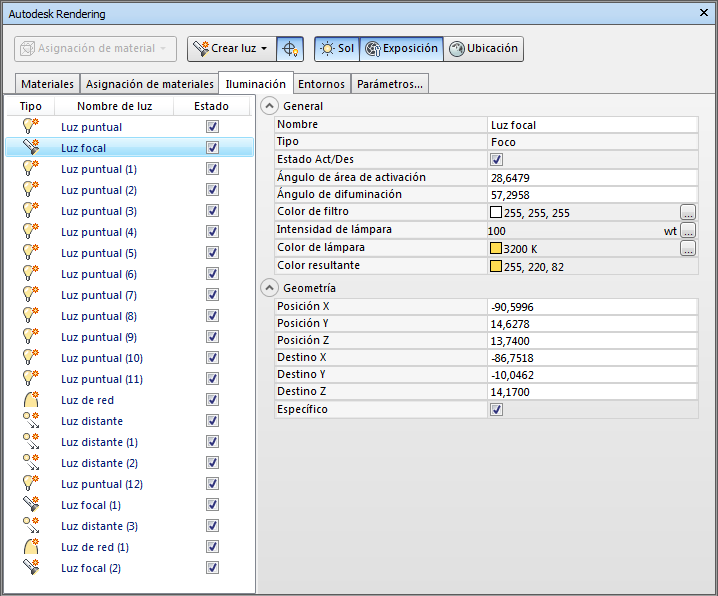 Todas las luces que añade al modelo se indican por nombre y tipo en la vista de luces. La casilla de verificación Estado le permite activar y desactivar las luces. Al hacer clic con el botón derecho en una luz, aparece un menú contextual. Al hacer clic en una luz, esta se selecciona y se muestran sus propiedades en la vista de propiedades. No se incluye la luz del sol y el cielo, pero puede ajustar las propiedades del sol y el cielo en la ficha Entornos.