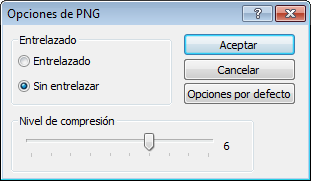 Para los archivos PNG, haga clic en el botón Opciones y, desde el cuadro de diálogo Opciones de PNG, especifique la configuración del Entrelazado y de la Compresión.