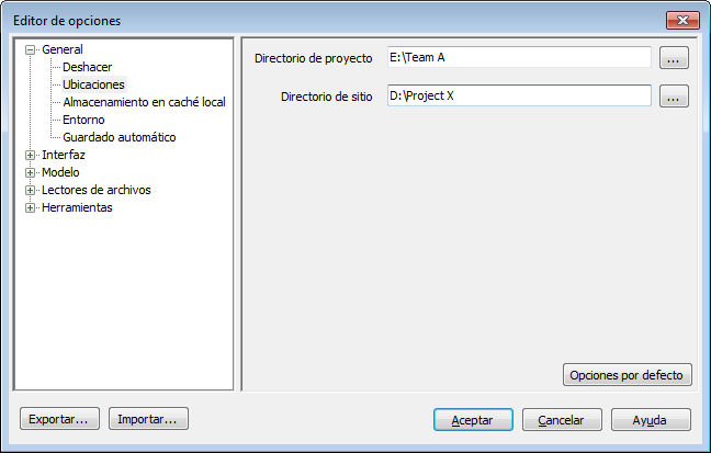 Nota: Cuando ejecuta Autodesk Navisworks por primera vez, se configuran los parámetros establecidos en el directorio de instalación. A continuación, Autodesk Navisworks examina el perfil del usuario actual y el de todos los usuarios del equipo local y, a continuación, comprueba la configuración en el Directorio de proyecto y en el Directorio de sitio. Los archivos del Directorio de proyecto tienen prioridad.