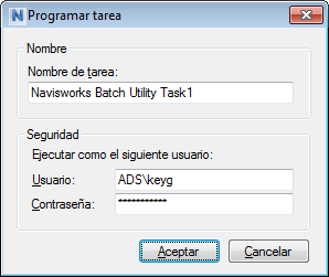 - En el cuadro de diálogo Programar tarea, cambie el nombre de tarea, si es preciso, y escriba su nombre de usuario y su contraseña. Haga clic en Aceptar.