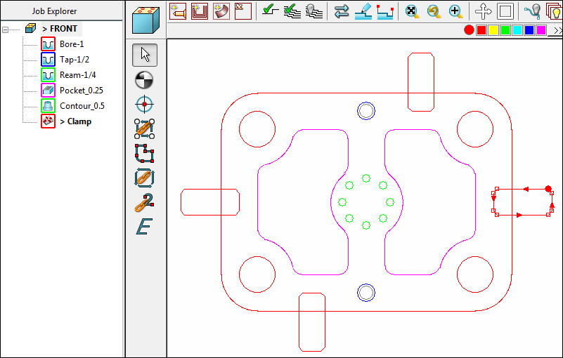 1. Using PartMaker's CAD mode, create 2D representations of the location of the work holding. In the following example, four hold-down clamps have been created: