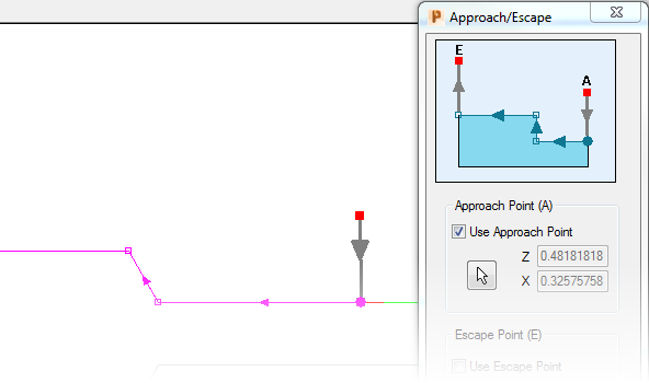To display the Approach/Escape dialog, select a profile in the CAM Face window and then select Part Features > Approach, Escapeor click