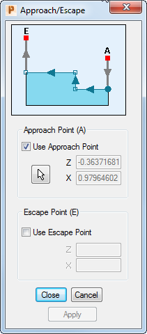 Use the Approach/Escape dialog to specify an approach and/or escape point for a toolpath. Approach and escape points define the location of the tool at the start and end of a toolpath and are used in addition to Lead In and Lead Out moves.