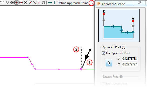 When the cross-hair cursor is at the location where you want to define the approach point, click the left mouse button. PartMaker updates the display within the CAM Face window and updates the coordinate values displayed on the Approach/Escape dialog to reflect your selection: