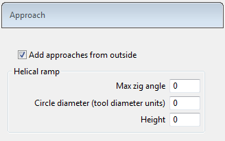 If you have a Vortex style selected, the Approach page has additional options, which enable you to specify the helical ramp moves that are added to Vortex toolpaths to ensure the tool approaches the stock safely and does not plunge into the stock. Vortex adds these moves when the (linear/arc) approach outside moves (specified on the Leads and Links pages) would result in the tool plunging into the stock.