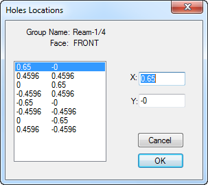Use the Holes Locations dialog to display, or change, the locations of all holes in the work group.