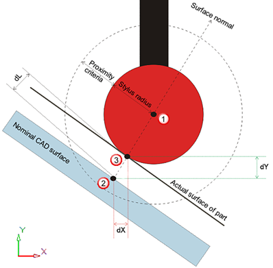 El centro del palpador. Esto actúa como el centro de la búsqueda radial para un contacto. El radio de búsqueda es igual al radio del palpador más el Criterio de proximidad configurado.