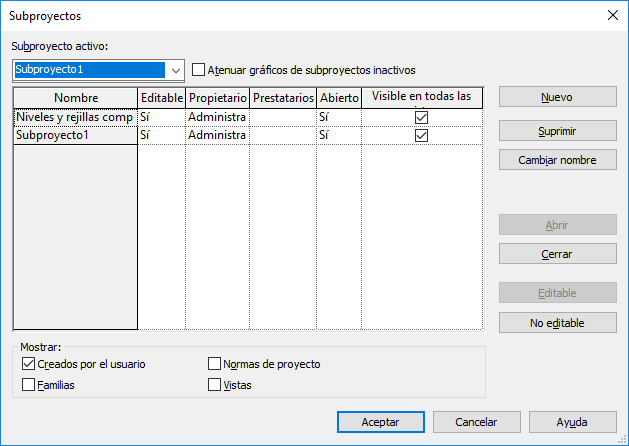 La imagen siguiente muestra el cuadro de diálogo Subproyectos, con los dos subproyectos creados por defecto por el usuario: Niveles y rejillas compartidos y Subproyecto1.