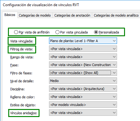 | Filtros de vista | Disponible solo para Personalizada. Especifica si el modelo vinculado se muestra con el filtro aplicado a la vista vinculada o la vista de anfitrión. No controla la visualización de modelos anidados. |