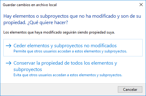 Esta opción guarda los cambios en el modelo local sin sincronizarlos con el central y abre el cuadro de diálogo Guardar cambios en archivo local. Ya que no sincronizó con el archivo central, aún tiene la propiedad de elementos que ha modificado.