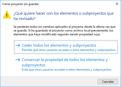 Esta opción anula todos los cambios realizados en el modelo local. No tiene efecto sobre la última operación de guardar el modelo local. Esta opción revierte el estado del modelo local al que tenía la última vez que se guardó y abre el cuadro de diálogo Cerrar proyecto sin guardar.
