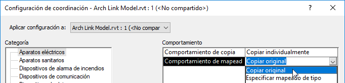 Al copiar instalaciones de un modelo vinculado a un modelo MEP (o antes de hacerlo), especifique un comportamiento de mapeado para cada categoría de instalación en el cuadro de diálogo Especificar la configuración de coordinación.