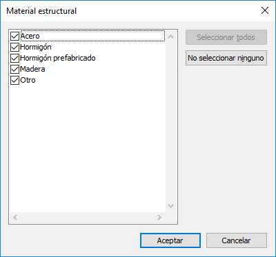 Seleccione los materiales que desea mostrar y haga clic en Aceptar. Todos están seleccionados por defecto.