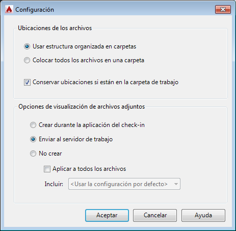 - En el cuadro de diálogo Aplicar check-in, pulse el botón Configuración y seleccione Enviar al servidor de tareas en la sección Opciones de visualization Attachment.