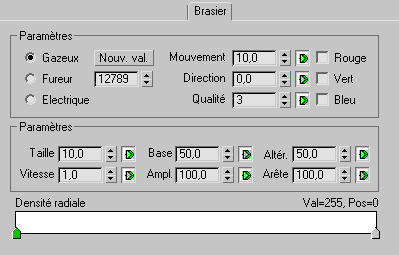 Remarque : les champs à double flèche Mouvement et Direction définissent le mouvement du motif fractal dans les directions X et Y. Vous pouvez contrôler la direction Z à l'aide de l'option Vitesse, sous les Paramètres correspondant aux types de brasiers.