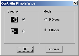 Ce filtre balaye d'image en image (ou transition noire). L'image filtrée reste en place, mais elle est découverte ou effacée par un balayage. En général, lorsque vous utilisez un événement Filtre Simple Wipe, vous utilisez également un compositeur Alpha comme événement Couche.