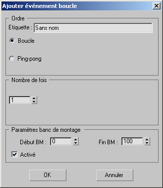 Les boîtes de dialogue Ajouter événement boucle et Editer événement boucle présentent les mêmes commandes.