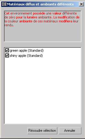 L'utilitaire de résolution des couleurs ambiantes recherche dans la scène courante les matériaux standard dont les couleurs ambiantes et diffuses sont différentes, vous offrant la possibilité de copier la couleur diffuse dans le canal de couleur ambiante. Vous pouvez ainsi obtenir des rendus cohérents avec ceux produits par les versions précédentes des applications.