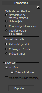 - Navigateur de matériaux/mapsVous permet de choisir un matériau à exporter à partir du Navigateur de matériaux/maps.