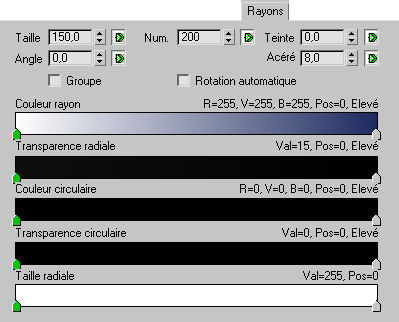 Les paramètres relatifs aux rayons sont rassemblés dans l'onglet Rayon de la boîte de dialogue Lens Effects Flare.