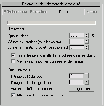 - Lorsque vous cliquez sur Début, une copie de la scène 3ds Max est chargée dans le moteur de radiosité. Cliquez sur Réinitialiser tout pour effacer toute la géométrie du moteur.