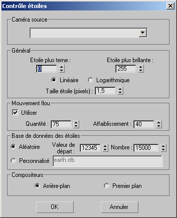 - Aléatoiregénère le nombre d'étoiles indiqué par le champ à double flèche Nombre, en utilisant la valeur départ du nombre aléatoire pour initialiser le générateur de nombres aléatoires.