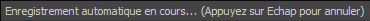 Si vous ne souhaitez pas prendre le temps d'enregistrer le fichier de sauvegarde automatique, vous pouvez appuyer sur la touche Echap pour arrêter la sauvegarde automatique (Le message "Enregistrement automatique en cours" est généralement bref : il s'affiche à l'écran uniquement lors de l'enregistrement de fichiers très volumineux et vous pouvez interrompre la sauvegarde automatique pour pouvoir continuer à travailler).