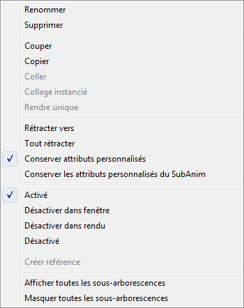 Lorsque cette option est activée, la réduction de la pile de modificateurs d'un objet ou sa conversion dans un autre format tel que Poly éditable préserve tous les attributs personnalisés appliqués à une mention Choisir explicitement une piste ou à des pistes de modificateurs de la pile. Disponible uniquement lorsque l'option Conserver attributs personnalisés est activée (voir ci-dessus).