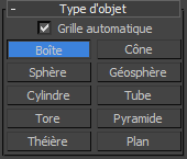 Une fois l'objet créé, 3ds Max le place sur une grille de construction temporaire. Lors de la création d'un objet, 3ds Max place l'objet créé sur la grille courante active si le curseur ne figure sur aucun autre objet.