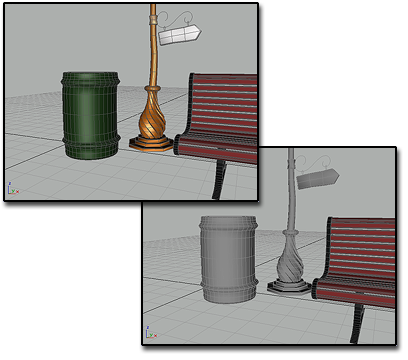 Vous pouvez geler une sélection d'objets dans votre scène. Les objets gelés, qu'ils soient sous forme filaire ou en mode rendu, deviennent gris foncé par défaut. Les objets restent visibles mais ne peuvent pas être sélectionnés ; par conséquent, vous ne pouvez ni les transformer ni les modifier directement. Vous pouvez geler des objets pour les protéger contre des éditions accidentelles et redessiner plus rapidement l'écran.