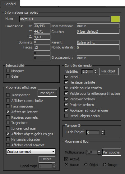 Cet onglet de la boîte de dialogue Propriétés objet affiche des informations générales sur l'objet, ainsi que des commandes pour le rendu de l'objet et son affichage dans les fenêtres.