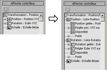 Remplace les contrôleurs courants de rotation et de position de l'objet ou des objets sélectionné(s) par des contrôleurs de liste contenant la configuration Geler transformation. Cette configuration comprend un contrôleur de position (Bézier)/rotation (Euler XYZ) gelée suivi par un contrôleur "zéro ..." qui utilise le contrôleur par défaut pour la transformation (position XYZ et Euler XYZ respectivement). Une fois que vous avez gelé une transformation d'objet, vous pouvez rétablir sa position et son orientation gelées à l'aide de la commande Transformer du début (voir ci-dessous).